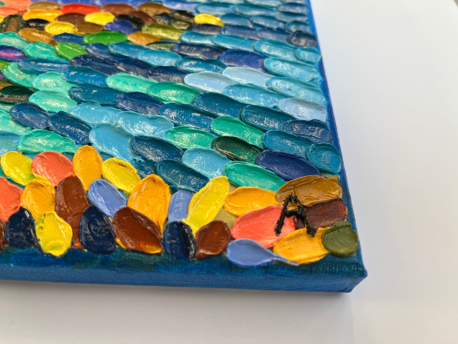 Impasto oil painting "At the Cyprus sea side" is made on a canvas panal, measuring 20x25 cm. Using palette knife technique artist created an impasto painting with thick mosaic-like palette knife strokes. This colorful piece of art depicting a sunny coast line and Mediterranean sea will become a bright touch of art in your home. Make art part of your life with this original painting!