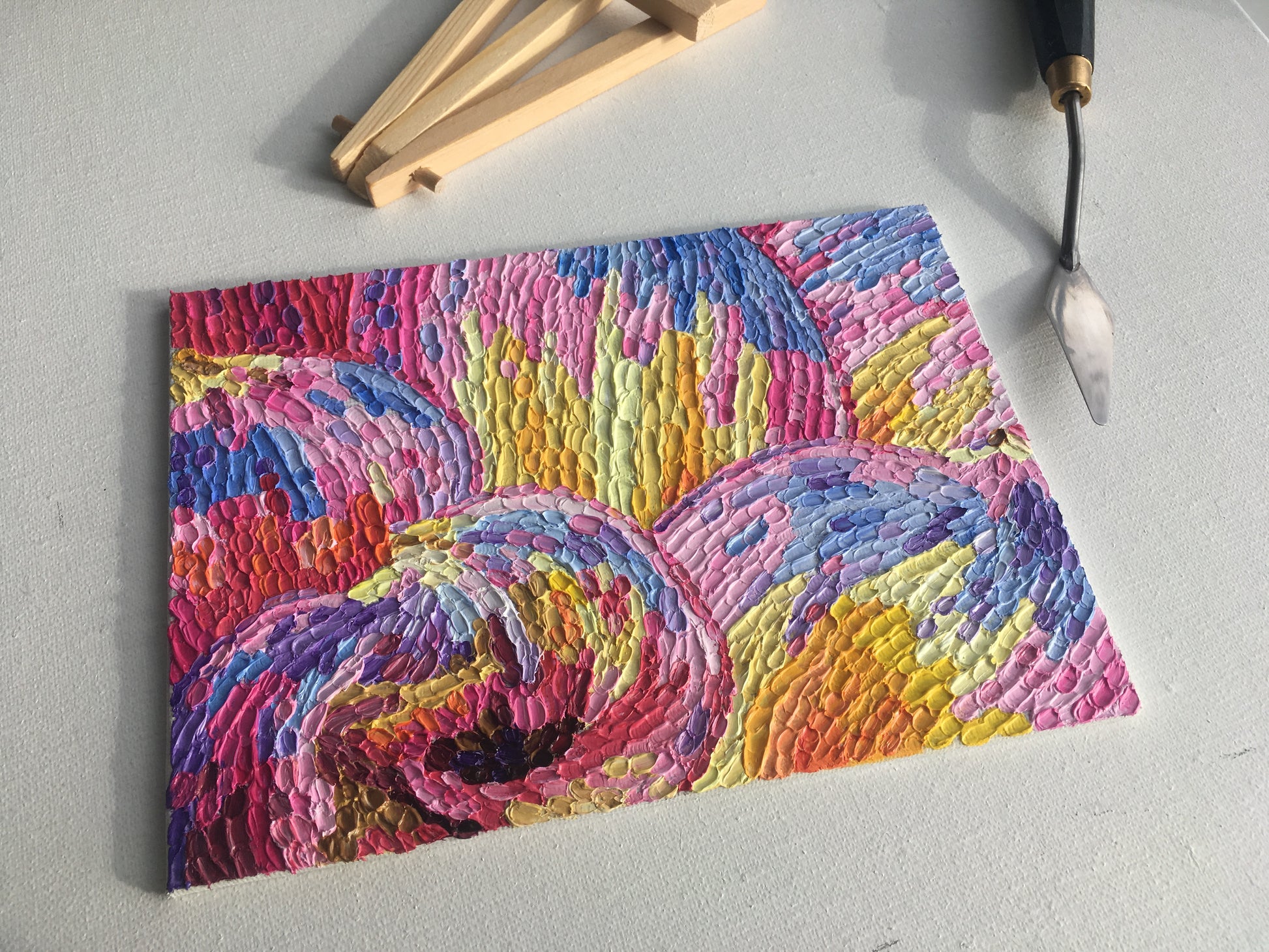 Impasto oil painting "Pink and yellow Dahlia" is made on a canvas panal, measuring 18x13 cm. Using palette knife technique artist created an impasto painting with thick mosaic-like palette knife strokes. This colorful piece of art depicting a close-up of a beautiful flower Dahlia will become a unique touch of art at your home. Make art part of your life with this original painting!