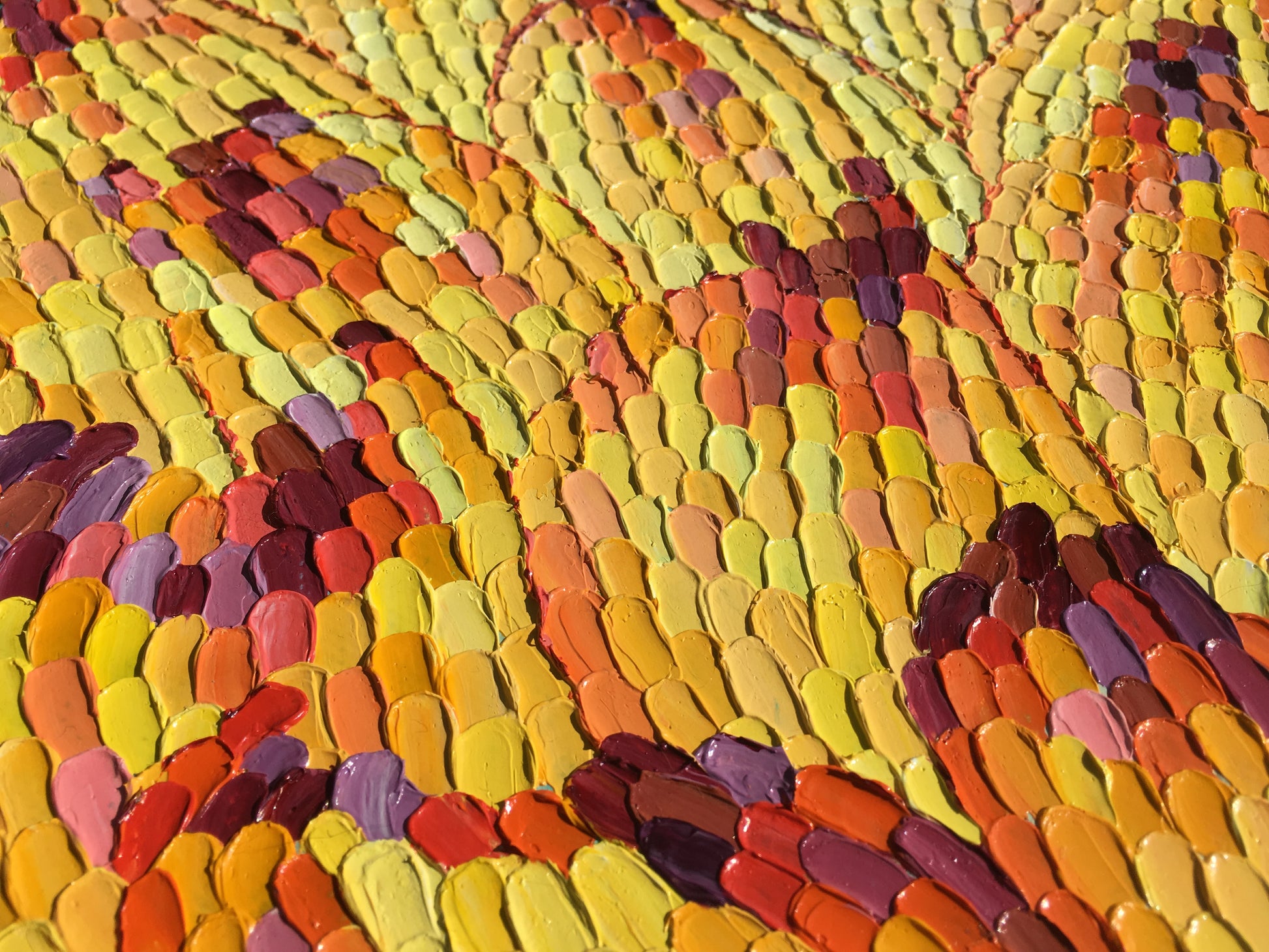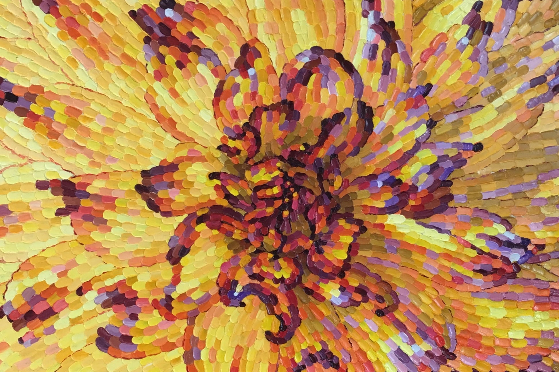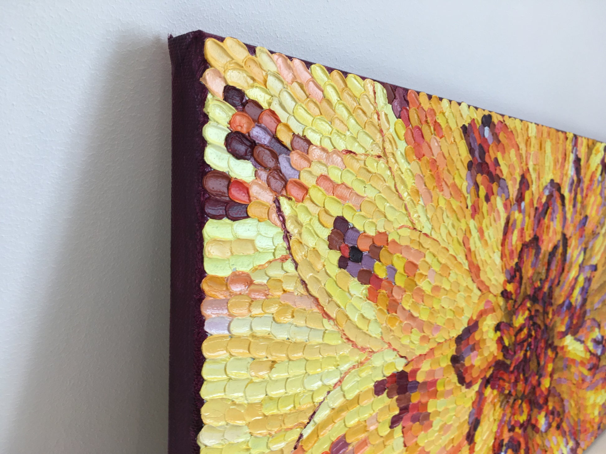 Impasto oil painting "Yellow and orange Dahlia" is made on a canvas panal, measuring 30x60 cm. Using palette knife technique artist created an impasto painting with thick mosaic-like palette knife strokes. This colorful piece of art depicting a close-up of beautiful flower Dahlia will bring unique atmosphere to your home. Make art part of your life with this original painting!